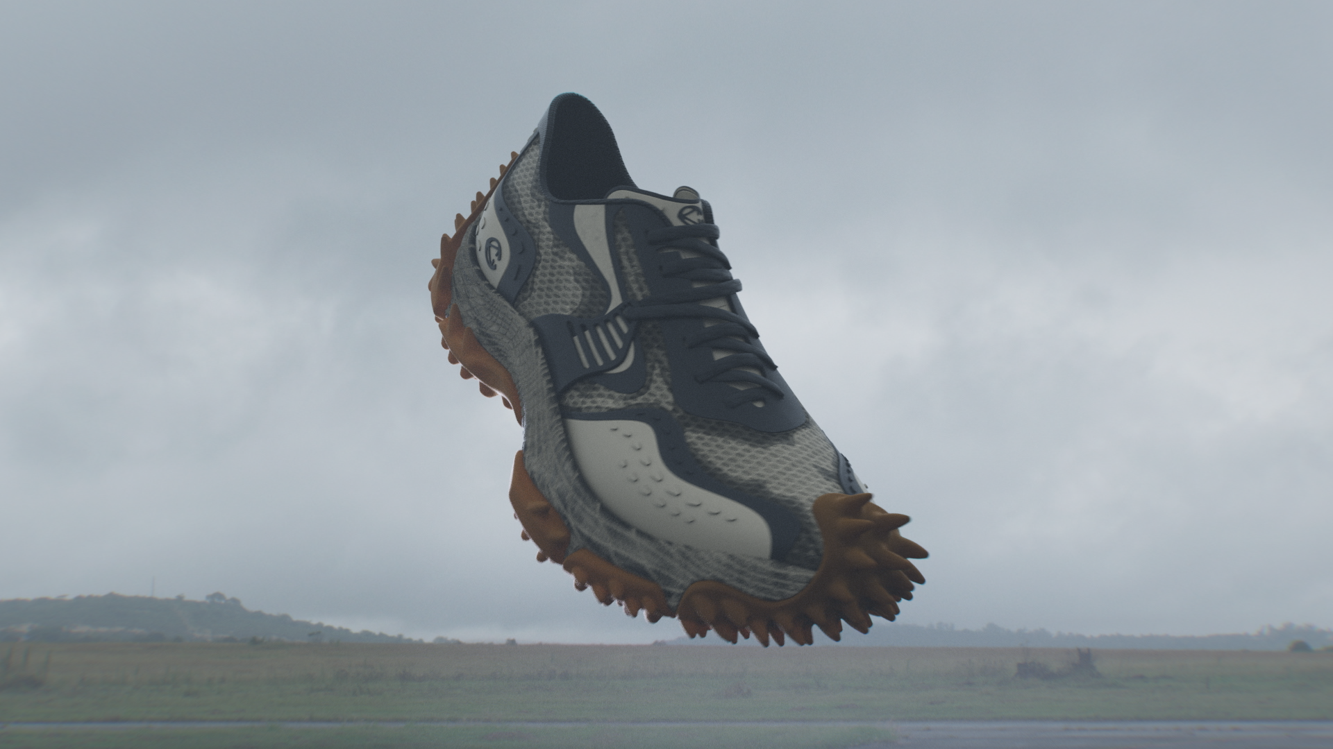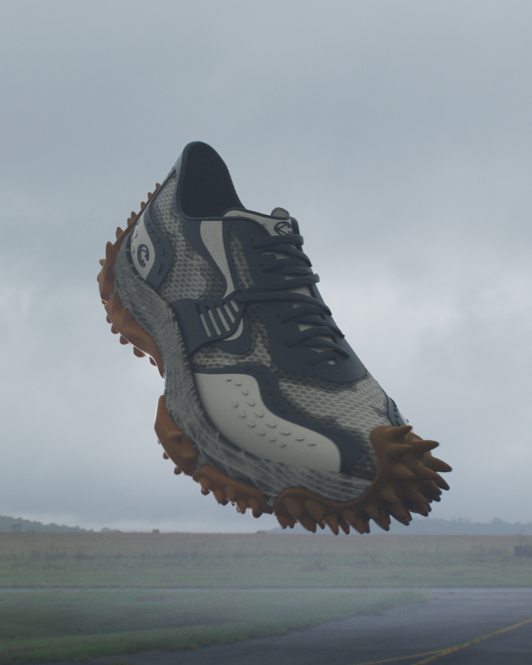 A collision of futuristic form with functional edge, Tornado is defined by a spiked rubber compound spanning the outsole from heel to toe for exceptional grip and traction. A sculptural, reptilian midsole wraps the single-piece KPU-injected upper for durability, with recycled mesh for ventilation.